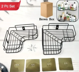 2PCS CORNER SELF METAL, Metal Shower Shelf Set (2 Pc) – No-Drill Bathroom Corner Organizer with 4 Adhesive Hooks | Wall-Mounted Bathroom Accessories & Storage Shelves(8901)