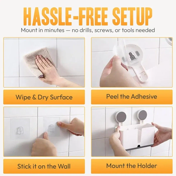 - Easy Installation: Featuring a strong adhesive backing, this holder can be mounted on the wall without the need for drilling or hardware, protecting your walls and tiles.