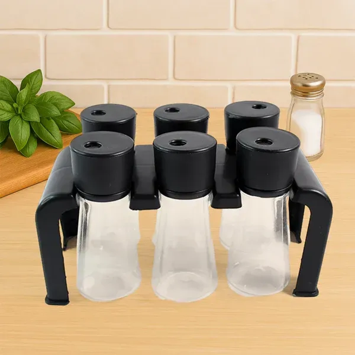 Organize your spices effortlessly with this 6-piece plastic jar set, complete with a sturdy stand for easy storage and access. Each jar features a clear body and secure lids to keep your spices fresh and visible at a glance. Perfect for kitchens of all sizes, this set helps keep your cooking essentials neat, accessible, and beautifully displayed.