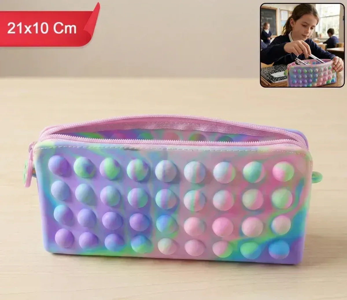 Make school fun and stress-free with this Multicolor Pop It Silicone Pencil Pouch (21x10 cm). Designed with a trendy bubble press fidget pattern, this pouch not only stores stationery but also provides a satisfying stress-relief experience for kids.